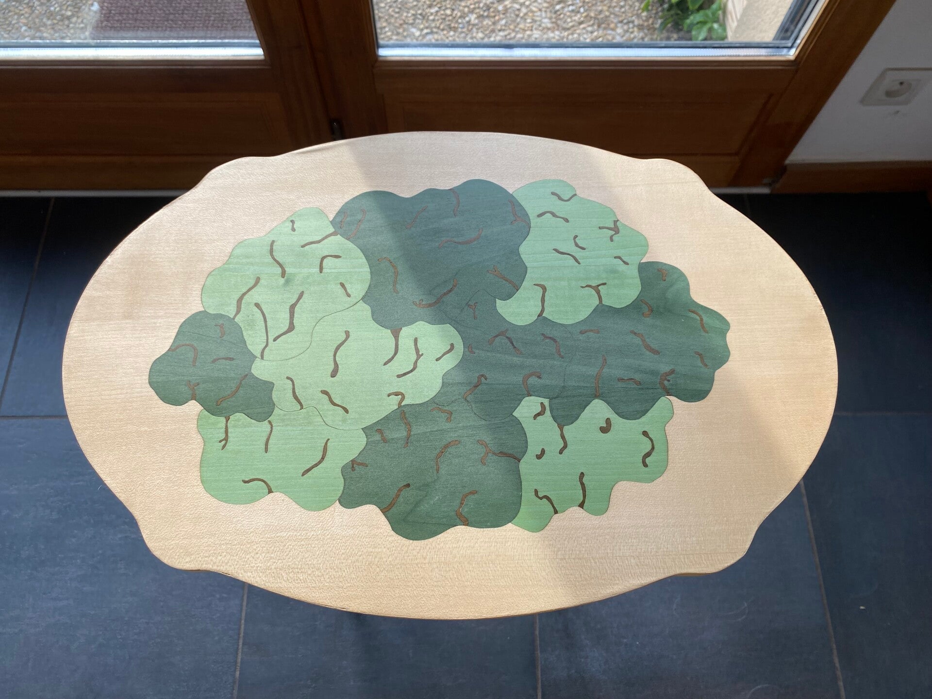 Piètement plaqué en feuille de pierre.